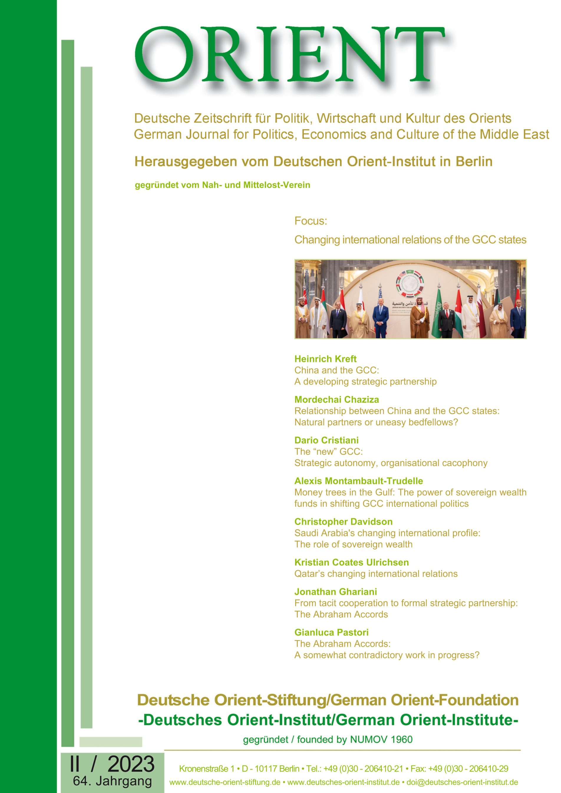 In the first two articles, Heinrich Kreft and Mordechai Chaziza examine the growing role of China in the Gulf region. Subsequently, Dario Cristiani analyses the changing international relations of the Gulf states and what these mean for the GCC as an institution, before Alexis Montambault-Trudelle and Christopher M. Davidson shed light on the role of sovereign wealth funds in the GCC states’ global ambitions in their contributions. Subsequently, Kristian Coates Ulrichsen zooms in on Qatari foreign policy. To finish this issue, Jonathan Ghariani and Gianluca Pastori both analyse how the Abraham Accords have impacted the region.